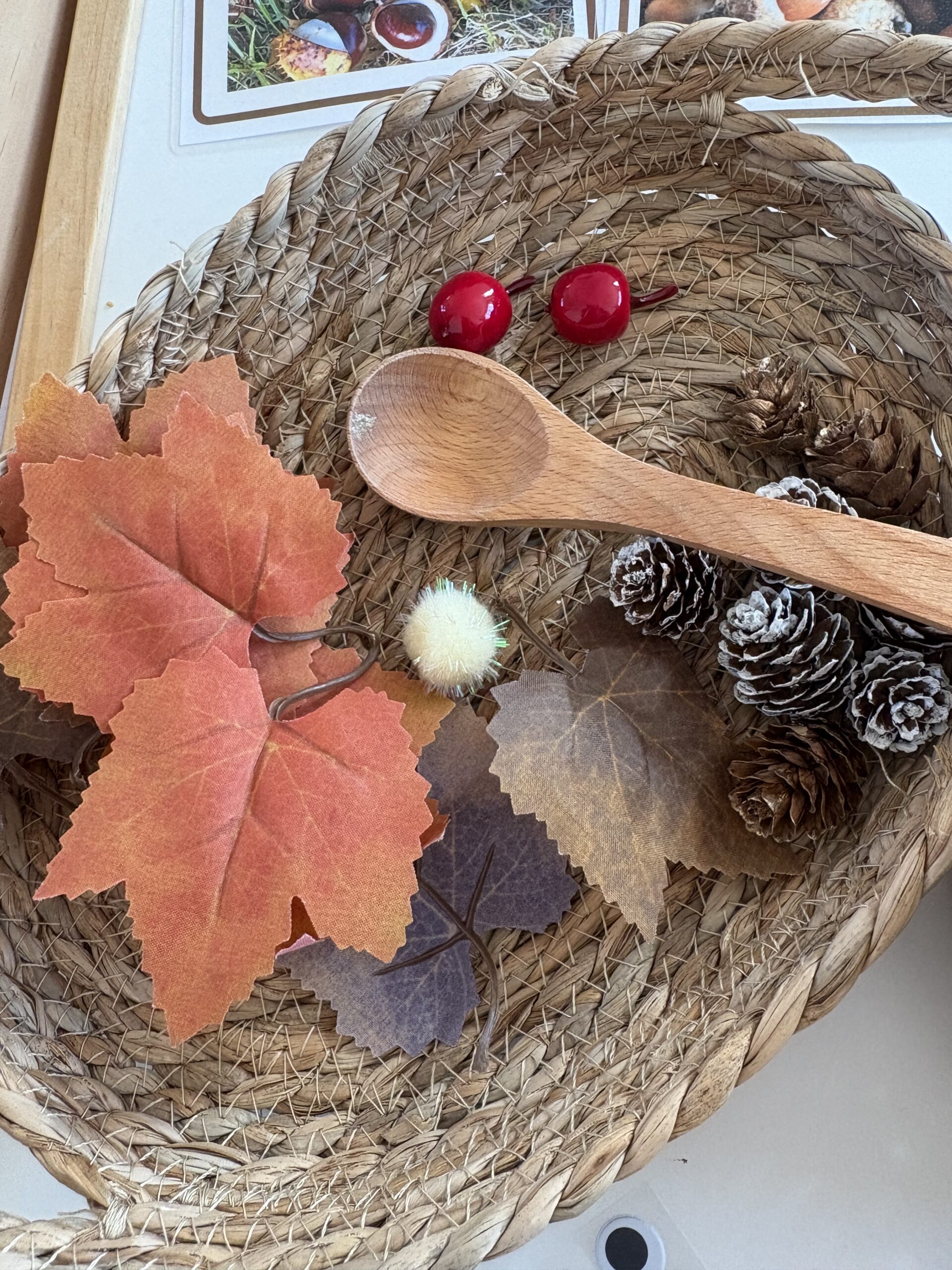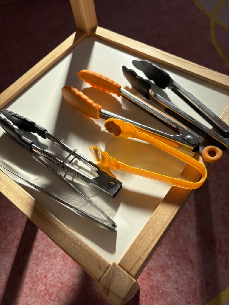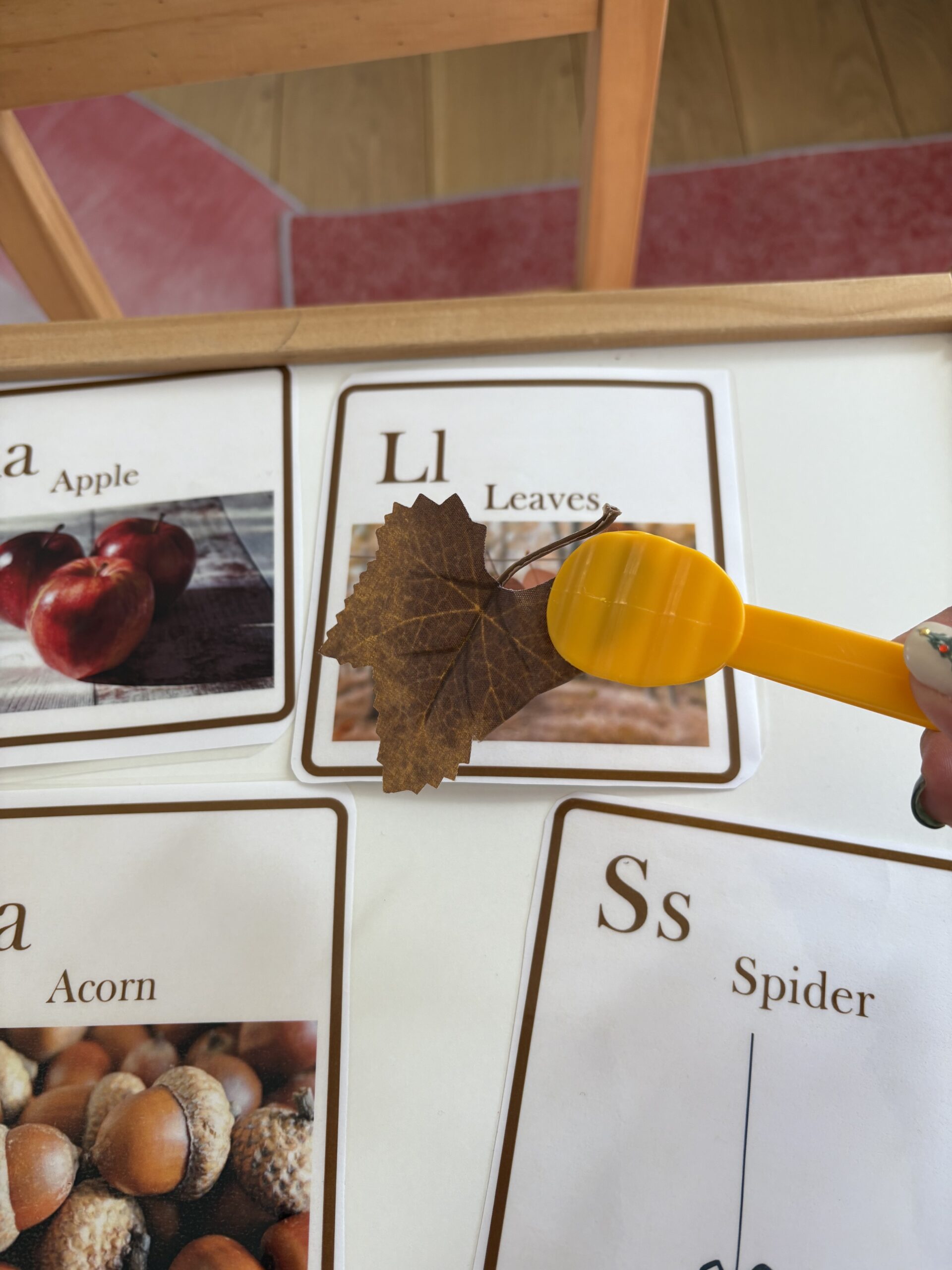 This month’s activity was a simple yet delightful “Autumn Nature Tray”, where kids arranged apple and acorn motifs on plastic leaves using tongs or tweezers.
